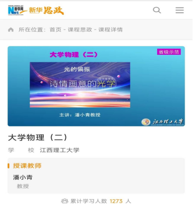 能源与机械工程学院潘小青教授主讲的《大学物理(二)》课程上线新华网“新华思政——全国高校课程思政教学资源服务”平台。本课程为江西省本科高校课程思政示范课程,也是六合彩开奖