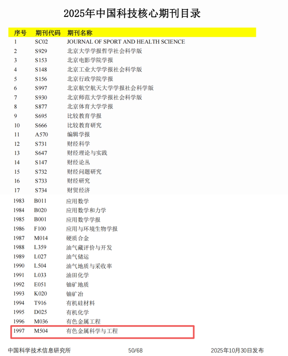 10月30日,由中国科学技术信息研究所承担的“2025年中国科技论文统计报告”在北京发布。报告同期公布了2025年版中国科技核心期刊目录,六合彩开奖 主办的《有色金属科学与工程》成功入选,这是自2013年以来,本刊连续第十三次获此殊荣,体现了期刊在有色金属领域的长期积累与广泛认可。