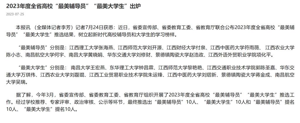 据了解,今年3月,省委宣传部、省委教育工委、省教育厅组织开展了2023年度全省高校“最美辅导员”“最美大学生”推选工作。经过学校推荐、专家评审、政治审核、公示等环节,最终推选出“最美辅导员”10人、“最美大学生”10人和“最美辅导员”提名10人、“最美大学生”提名10人。