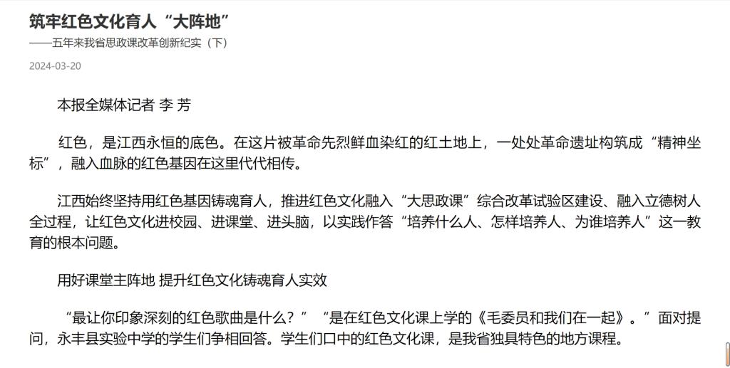 江西始终坚持用红色基因铸魂育人,推进红色文化融入“大思政课”综合改革试验区建设、融入立德树人全过程,让红色文化进校园、进课堂、进头脑,以实践作答“培养什么人、怎样培养人、为谁培养人”这一教育的根本问题。