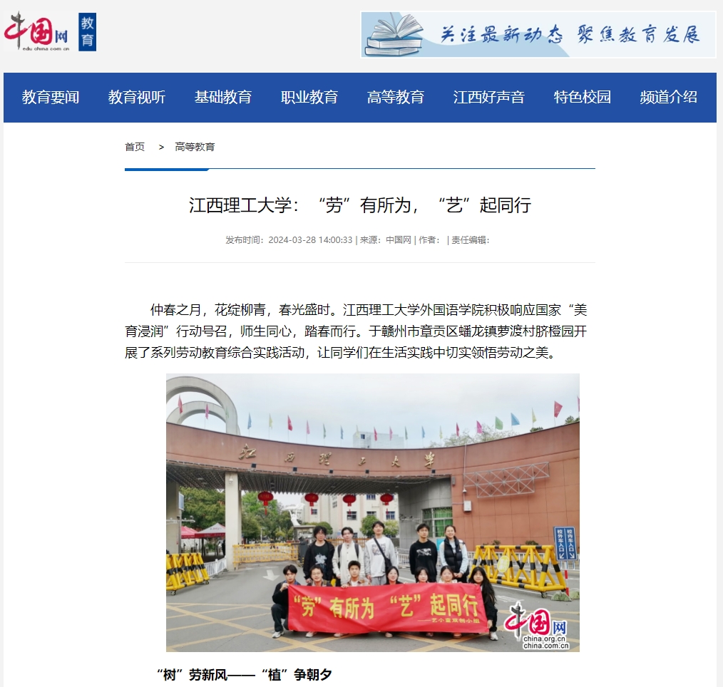 外国语学院积极响应国家“美育浸润”行动号召,师生同心,踏春而行。于赣州市章贡区蟠龙镇萝渡村脐橙园开展了系列劳动教育综合实践活动,让同学们在生活实践中切实领悟劳动之美。