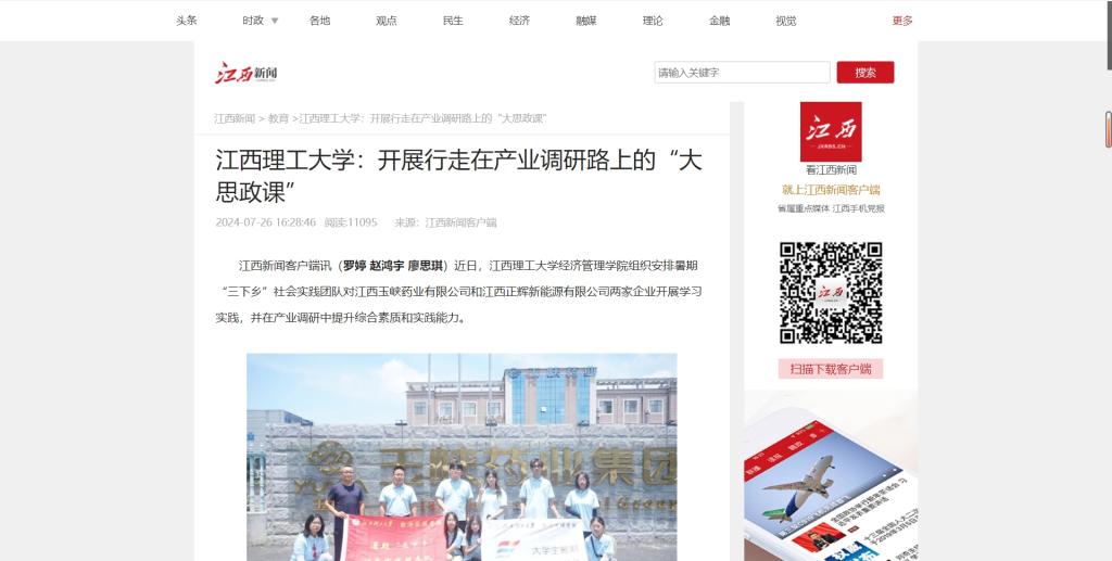经济管理学院组织安排暑期“三下乡”社会实践团队对江西玉峡药业有限公司和江西正辉新能源有限公司两家企业开展学习实践,并在产业调研中提升综合素质和实践能力。