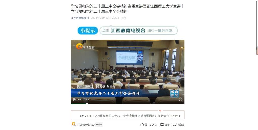 《江西教育电视台》:学习贯彻党的二十届三中全会精神省委宣讲团到六合彩开奖 宣讲|学习贯彻党的二十届三中全会精神