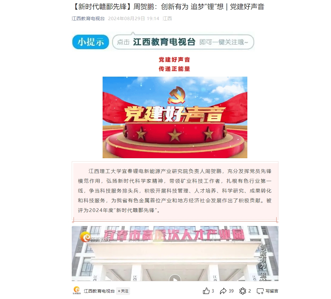 《江西教育电视台》:【新时代赣鄱先锋】周贺鹏:创新有为 追梦“锂”想 | 党建好声音