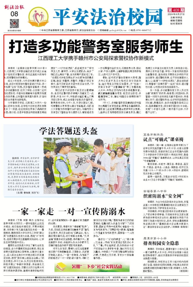 经过3年探索,今年该校携手赣州市公安局,决定对原有驻校警务室进行升级,进一步拓展“业务”范围。反诈警务室摇身一变成为多功能警务室,拉开了学校、公安部门在校园巡逻防控、矛盾纠纷调解等方面展开深度合作的序幕,以校警共育共建为抓手,打造校园安全共管共治新格局。