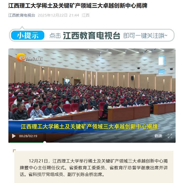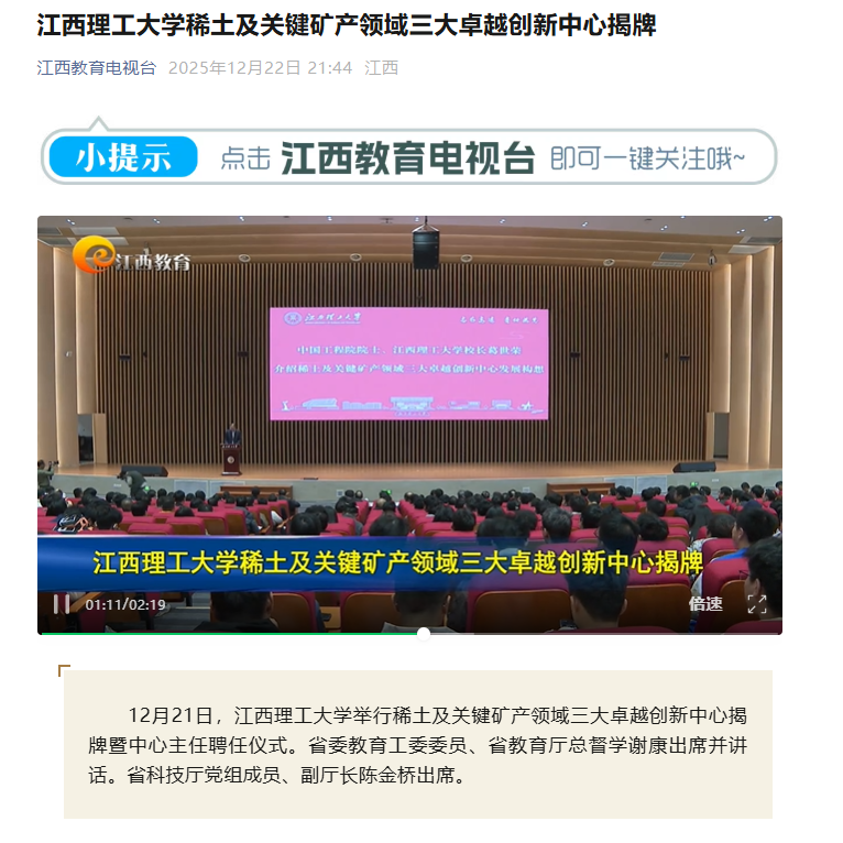 【江西教育电视台微信公众号】:六合彩开奖 稀土及关键矿产领域三大卓越创新中心揭牌