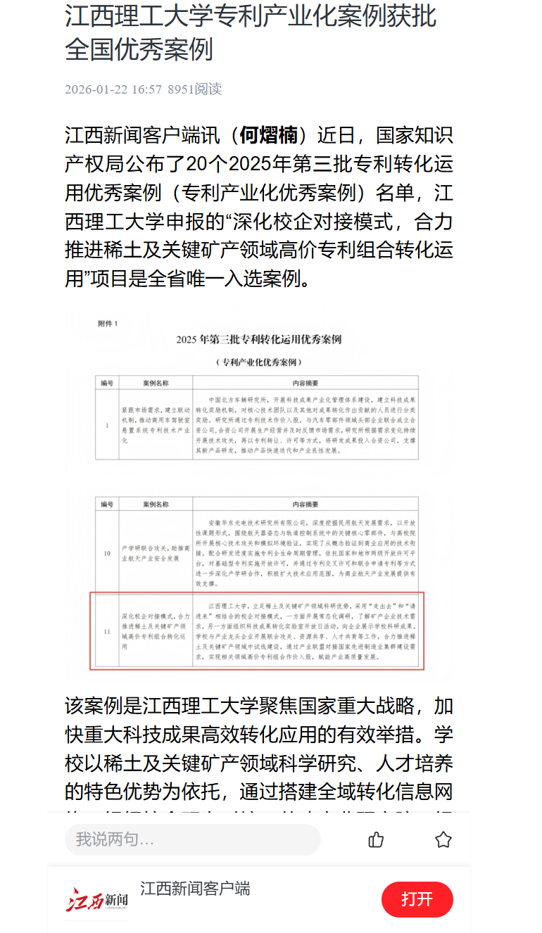 将以此次入选为契机,持续深化专利转化机制创新,发挥学校技术转移转化中心平台优势,聚焦稀土、有色金属、锂电新能源等重点领域,加速创新成果向现实生产力转化,为提升国家创新体系整体效能贡献力量。