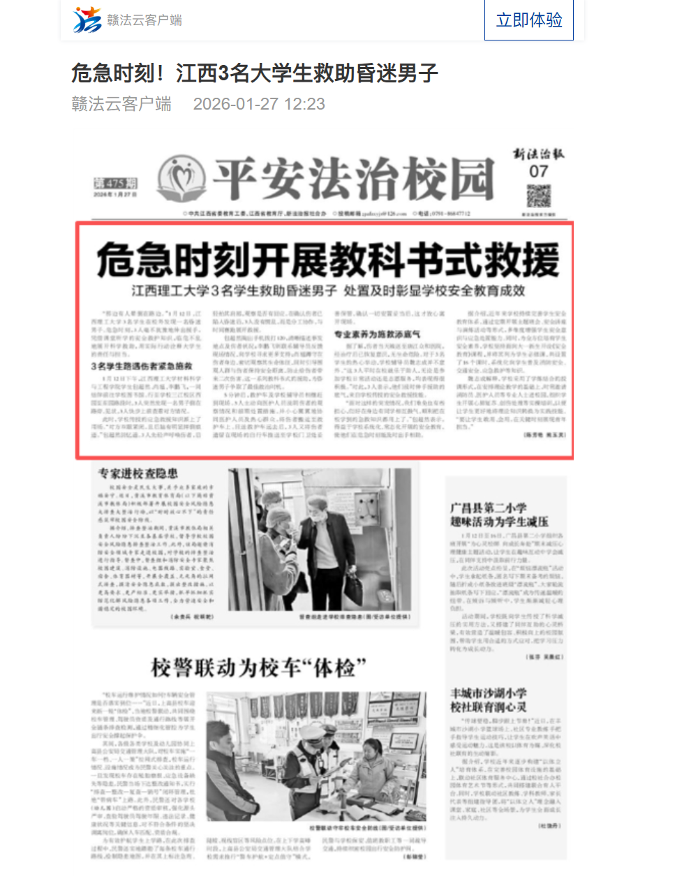 “面对这样的突发情况,我们难免也有些担心,但好在身边有同学相互鼓气,顺利把在校学到的急救知识都用上了。”包超然表示,得益于学校系统化、常态化开展的安全教育,使他们在危急时刻能及时出手相助。