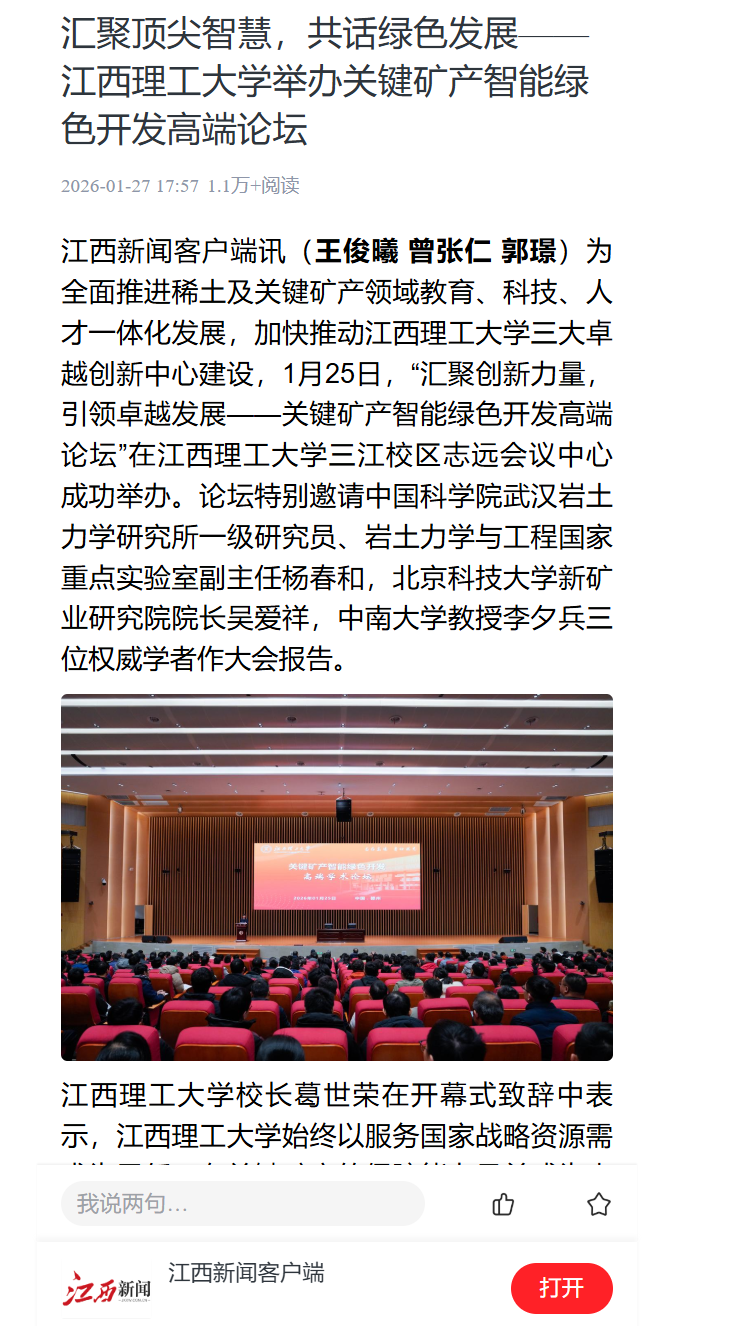 将以此次高端论坛为契机,持续浓厚校园学术氛围,推动学校在稀土及关键矿产领域产出更多创新成果,为我国关键矿产资源的安全、绿色、智能化开发贡献智慧和力量。