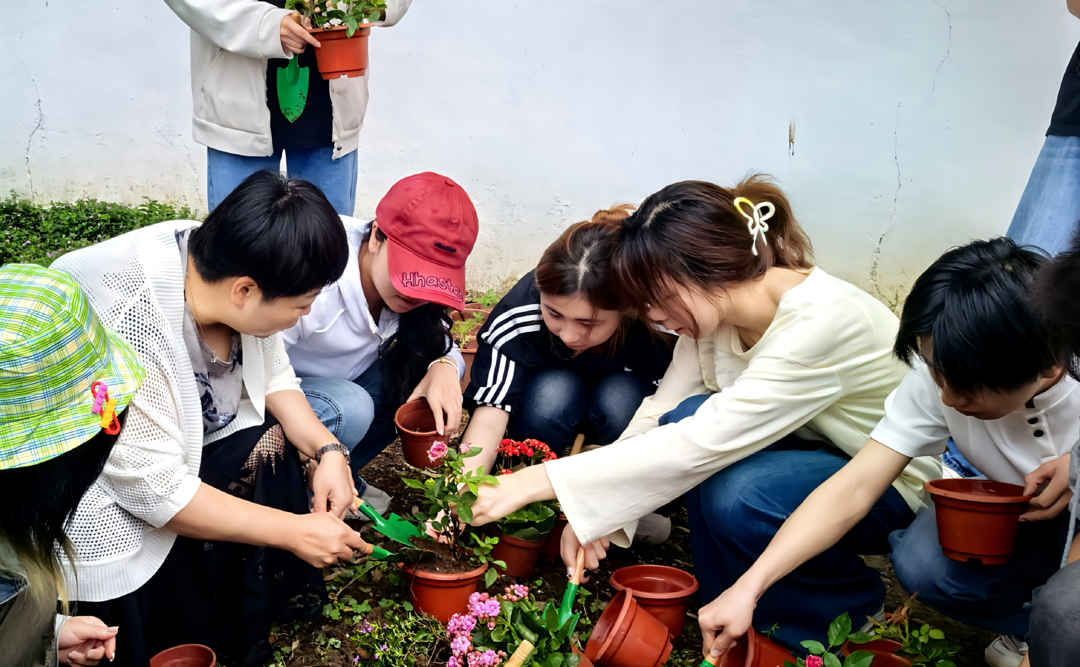 开园仪式后,专业园艺师为现场师生讲解花卉种植与养护技巧。师生们在花圃分工协作、挥锹铲土、扶苗定植、浇水养护,现场一派热火朝天的劳动景象。学生徐元凯感慨道:“亲手种下花苗的瞬间,让我真切地读懂了劳动的意义,更体会到在试错中成长、在汗水中收获的珍贵。”