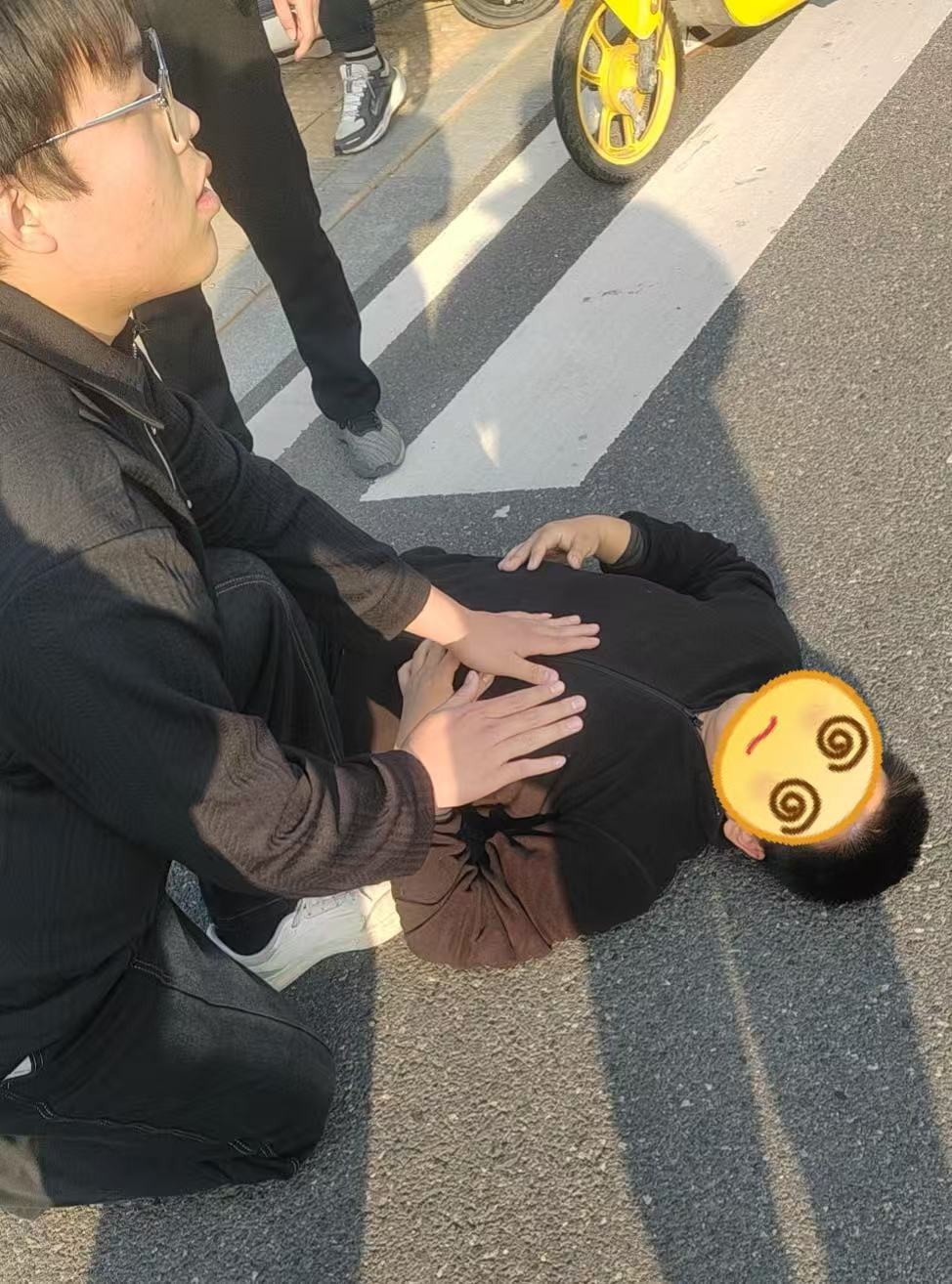当日下午,包超然、肖馗、李鹏飞三人结伴前往三江校区东园图书馆借阅资料,行至半路时,突然发现前方不远处有一名路人躺地不起。“有人晕倒了!”三人没有丝毫犹豫,立刻快步上前查看情况,在发现倒地路人双眼紧闭、意识不清,后脑有摔倒痕迹,情况十分危急后。凭借日常学习中掌握的应急救援常识,三人首先确认现场环境安全,随后轻声呼唤伤者并轻拍其肩部,观察是否有回应。在确认伤者无明显意识后,三人没有慌乱,迅速达成救援共识,一场与时间赛跑的紧急救助随即展开。