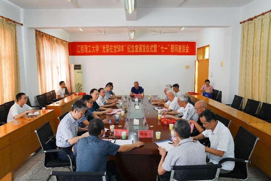 生活困难党员代表和老党员代表颁发“光荣在党50年”纪念章并发放慰问金,代表学校送上节日祝福和关心。