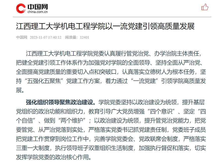 机电工程学院党委认真履行管党治党、办学治院主体责任,把健全党建引领工作体系作为加强党对学院的全面领导、坚持全面从严治党、全面提高党建质量的重要切入点和突破口,认真落实立德树人为根本任务,坚持“五强化五聚焦”党建工作方案,着力通过“一流党建”引领学院高质量发展。