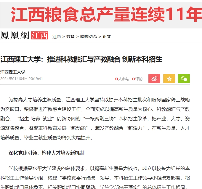 坚持以提升本科招生批次和服务国家稀土战略为突破口,积极推进产教融合建设工作,全面实施以提高新生质量为核心、科教融汇与产教融合、“招生-培养-就业”创新协同的“一核两融三协”本科招生改革,把产业、人才、资源聚集整合,凝聚本科教育发展“新动能”,激发产教融合“新活力”,在新生质量、人才培养质量、毕业生就业质量均得到大幅提升。