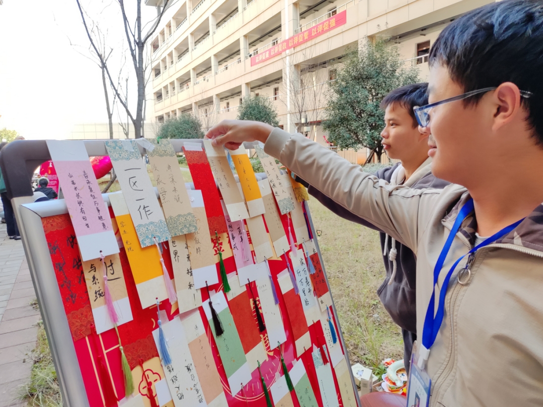 活动现场,墨香四溢,“年味”甚浓,所谓“无联不成春,有联春更浓”,在题写春联的摊位上,参与者们挥毫泼墨,笔走龙蛇,各显身手,将心底的祝福转化成了一副副对联,一时间“卷王生存”、各式各样的“福”字、趣味十足的对联围满了春联摊位,而另一边的书签祈福摊位也是热闹非凡,同学们在书签上写下自己的新年希望。“新年祈新福,看到这么多金灿灿的祝福,不论写得如何,大家也忍不住提笔写几句新年祝愿,祝福各位老师同学福启新岁,万事顺遂。”志愿者黄美玲有感而发。