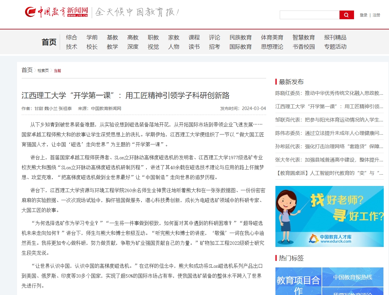 党委副书记罗仙平说到,熊大和博士对于高梯度磁选机的研制过程,实际上也是中国磁选机不断走向世界的历程,他的求学与科研历程,也极大地激励着学生们深入钻研、发展矿业类专业,为保障国家能源资源安全、为全面建设社会主义现代化国家作出贡献。(中国教育报-中国教育新闻网记者 甘甜  通讯员 魏小兰 张祖泰)