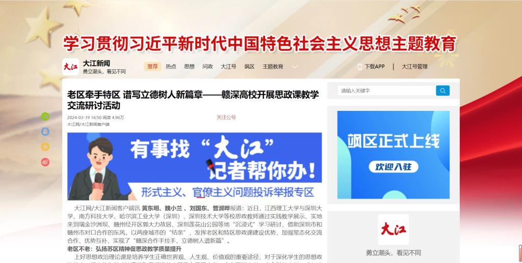与深圳大学、南方科技大学、哈尔滨工业大学(深圳)、深圳技术大学等校思政教师通过实践教学展示、实地来到瑞金沙洲坝、赣州经开区郭大力故居、深圳莲花山公园等地“沉浸式”学习研讨,借助深圳市和赣州市对口合作的东风,以两座城市的“结亲”,发挥老区和特区思政课建设优势,加强常态化交流合作、优势互补,实现了“赣深合作手拉手,立德树人谱新篇”。