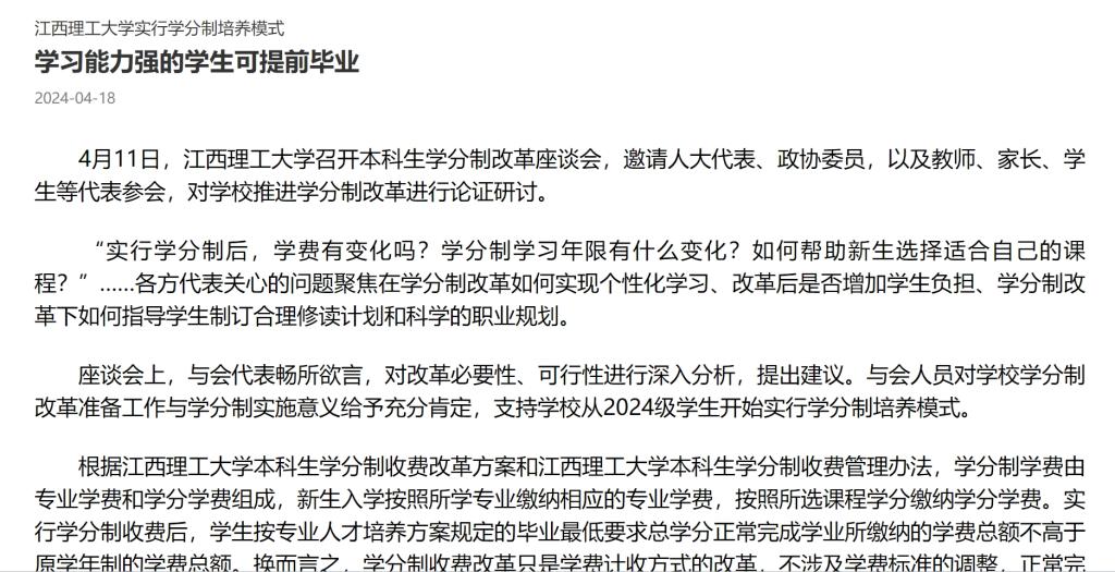 相关负责人表示,实行学分制改革,是学校本科人才培养模式创新的一大重要举措,是落实高等教育综合改革任务、建立现代大学制度的关键环节,是改革人才培养模式、优化教育教学管理的重要途径,是实施学生个性化培养、提升创新能力的有效手段。