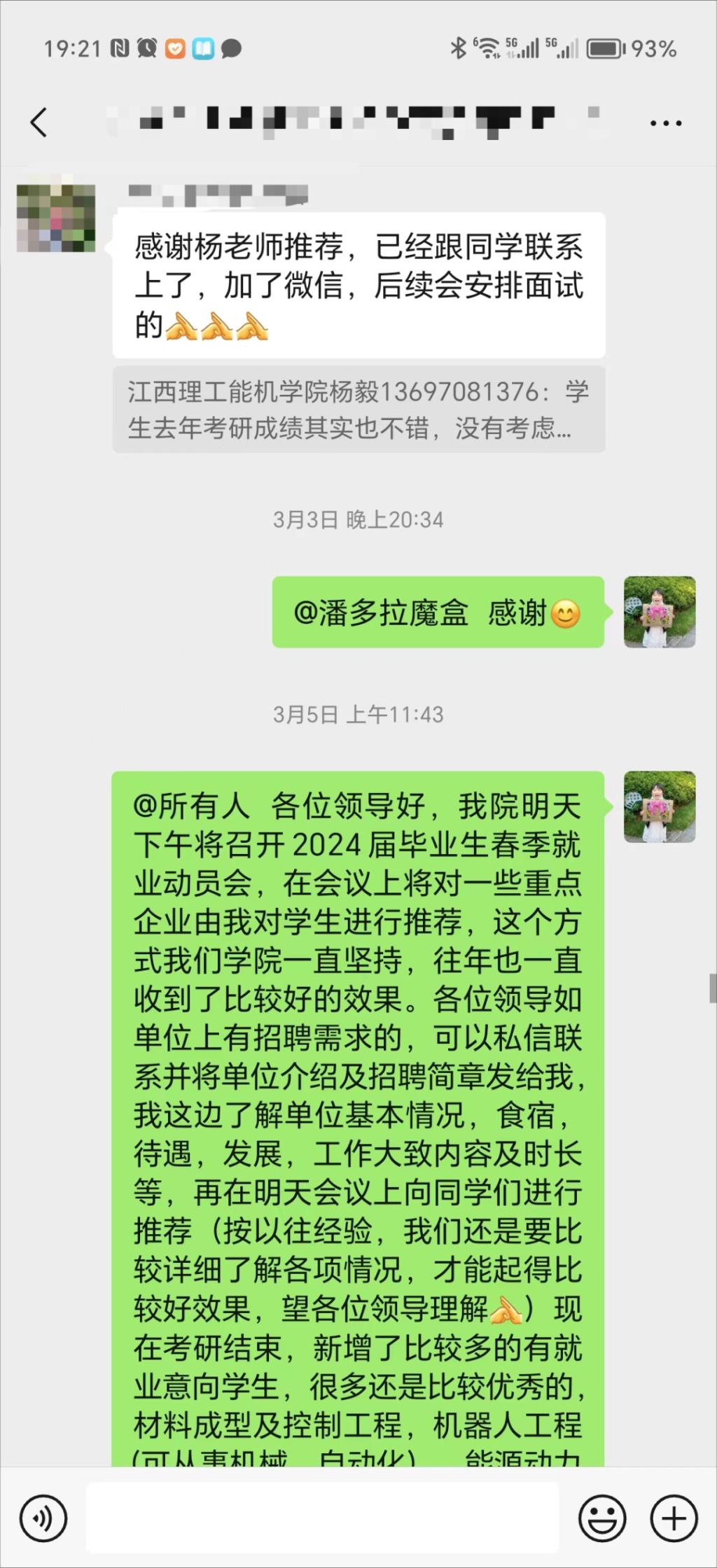 通过访企拓岗、校企洽谈会等方式尽可能多的掌握企业资源并了解企业产品、待遇、食宿、发展平台等情况,建立校企合作交流群。可将学生简历推送至校企合作交流群,并鼓励单位查看学生简历,主动抛出橄榄枝。