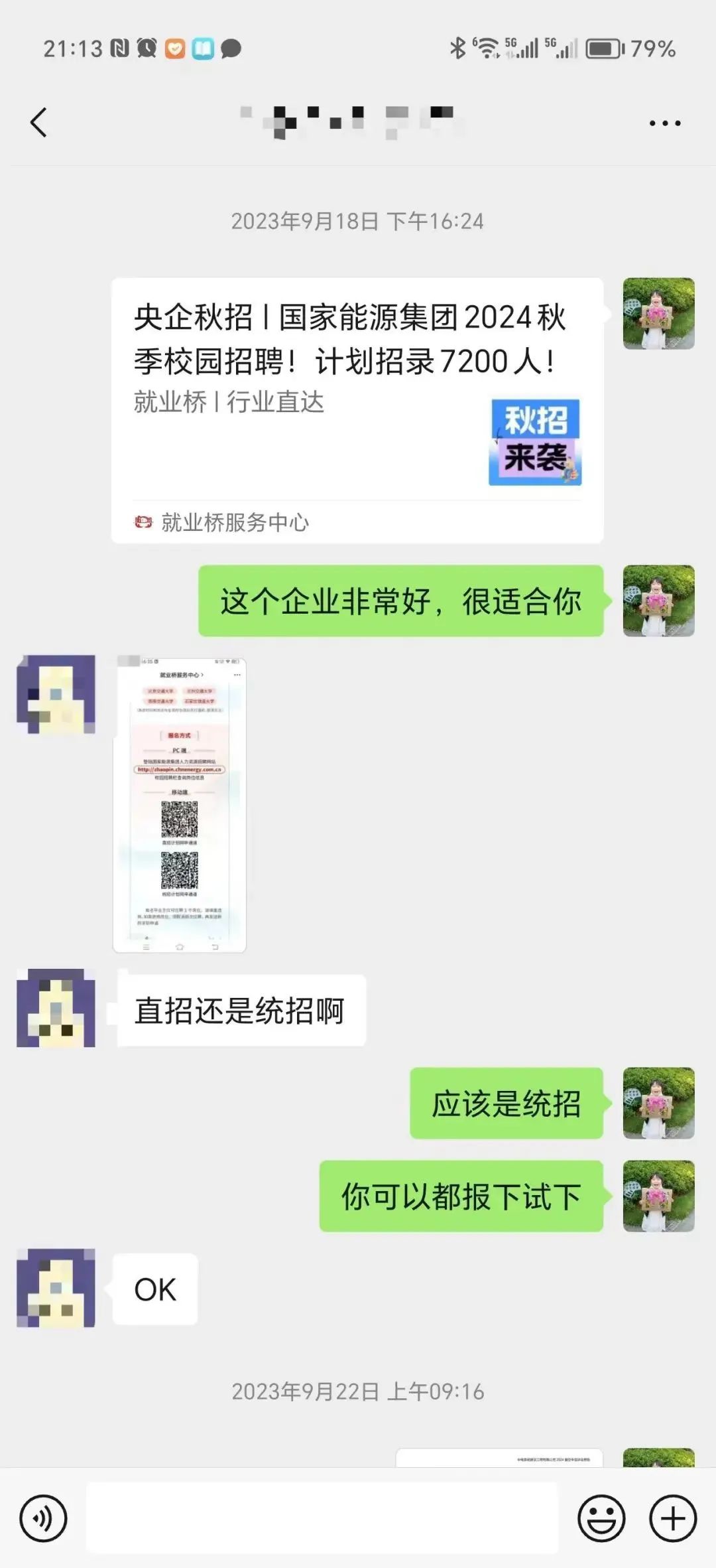利用校园招聘等场所多创造与毕业生一对一或一对多交流的机会,添加微信,全方位了解其真实就业意向,建立一对一联系。一旦有符合其就业意向的单位,则一对一联系学生进行推荐。