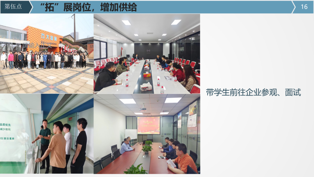 建立访企拓岗长效机制,一方面大力开展“走出去”,班子成员定期带队走访重点拓岗企业,加强对企业的了解,建立合作关系,另一方面扎实开展“引进来”,邀请行业知名公司来学院进行调研交流,让企业深入了解学院学科和专业建设情况,促成院企在人才培养等方面的合作,在有条件的情况下可以带学生直接前往企业参加参观、面试。学院近3年拓展企业120余家,岗位3000余个,为学生高质量就业提供了有力支撑。