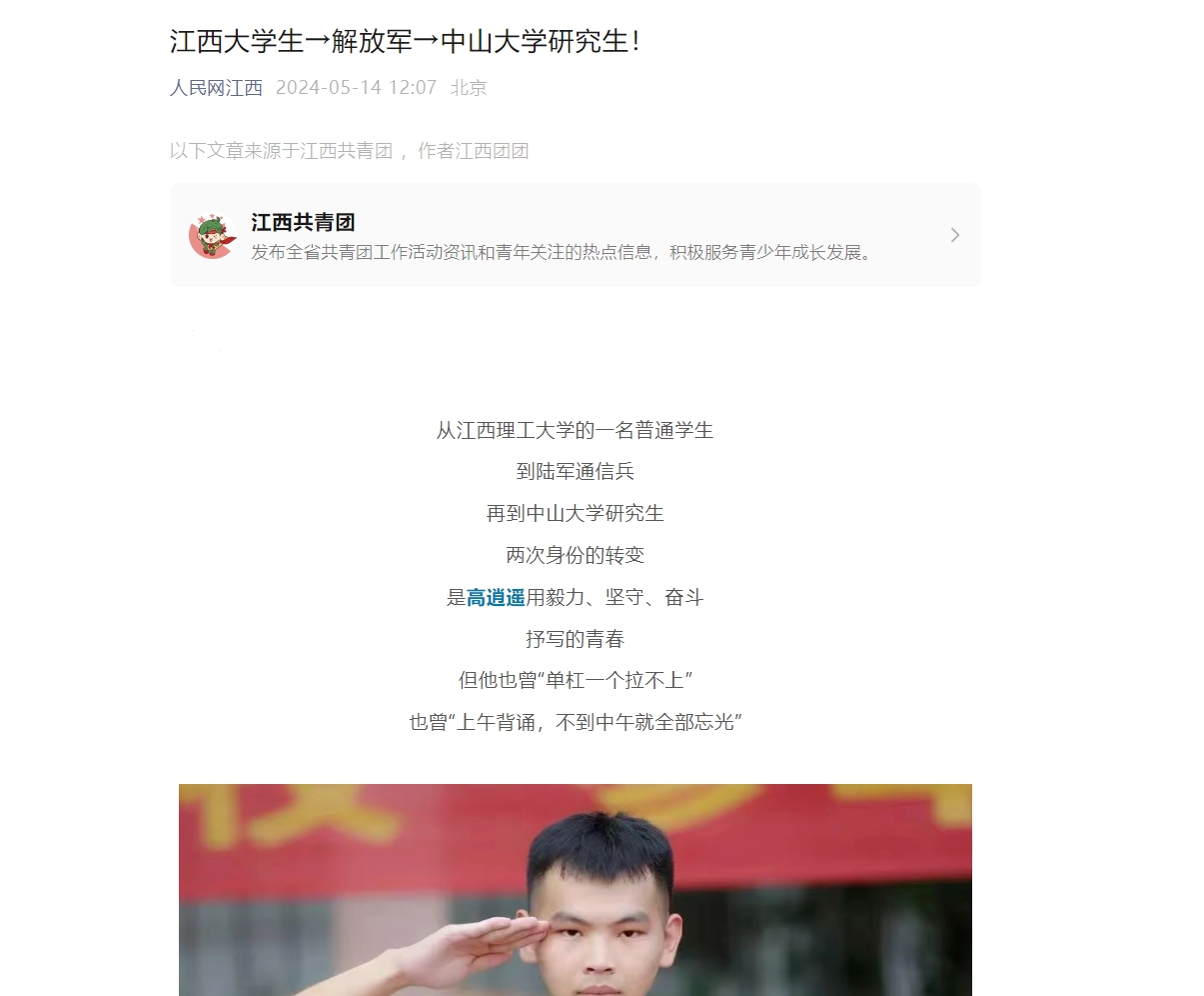 《人民网江西》:江西大学生→解放军→中山大学研究生!