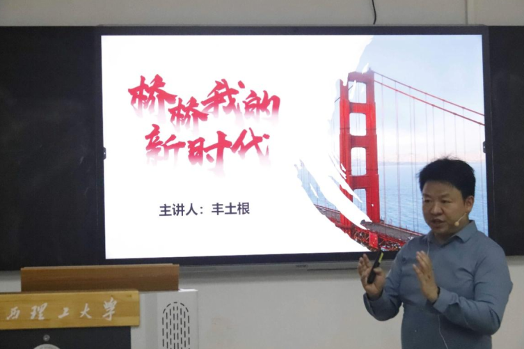 特聘教授丰土根结合土木工程专业,以“桥梁—我的新时代”为主题为学生们带来了一场“弘扬劳模精神 争做时代先锋”的主题思政课。