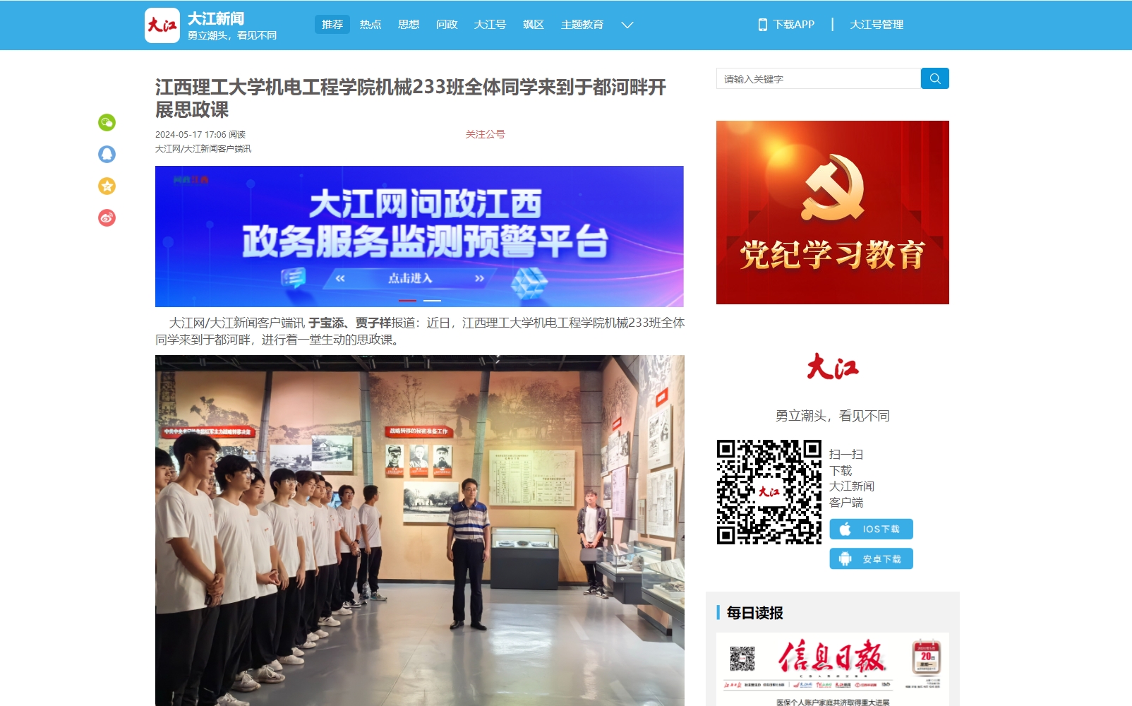 《大江新闻》:六合彩开奖 机电工程学院机械233班全体同学来到于都河畔开展思政课