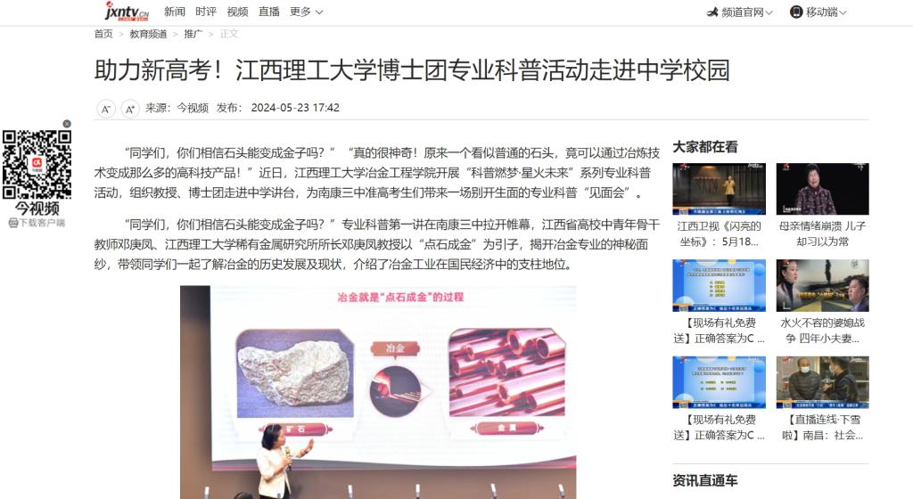 冶金工程学院贯彻“走出高校、走进校园”的理念,紧跟江西新高考政策的步伐,依托“神奇的稀土”江西省科普教育基地与多个国家、省市重点实验室,着力开展中小学学科、专业、科技等方面的科普宣传活动,帮助少年进行专业选择与发展规划,为国家科技兴国、人才强国战略的实施注入新动能、新血液。(图文 刘东佶、任天利、陈琰)