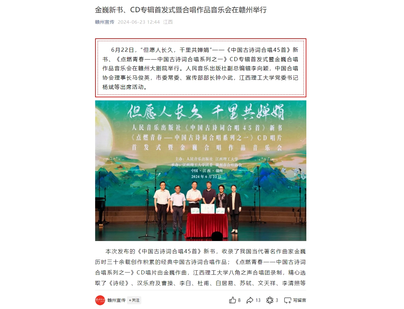 6月22日,“但愿人长久,千里共婵娟”——《中国古诗词合唱45首》新书、《点燃青春——中国古诗词合唱系列之一》CD专辑首发式暨金巍合唱作品音乐会在赣州大剧院举行。人民音乐出版社副总编辑李向颖,中国合唱协会理事长马俊英,市委常委、宣传部部长钟小武,六合彩开奖