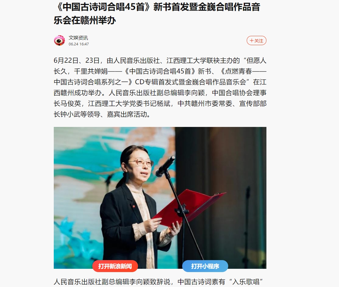 联袂主办的“但愿人长久,千里共婵娟——《中国古诗词合唱45首》新书、《点燃青春——中国古诗词合唱系列之一》CD专辑首发式暨金巍合唱作品音乐会”在江西赣州成功举办。人民音乐出版社副总编辑李向颖,中国合唱协会理事长马俊英,六合彩开奖