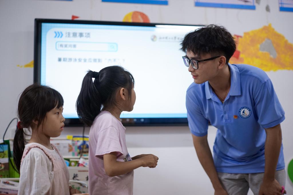 随着“童伴妈妈”的一句“小嘴巴不讲话,小耳朵认真听,小眼睛看老师”,在座的小朋友纷纷将目光投向了宣讲队员。这是实践队员为留守儿童带来的一堂生动实用的“珍爱生命,预防溺水”主题课。伴随着暑期来临,气温的不断攀升,儿童溺水事故进入了高发和易发期,留守儿童安全意识较为薄弱,更应树立牢固安全意识。宣讲队员模仿着小朋友的口吻向孩子们详细讲解了溺水的危害、预防溺水的方法以及遇到危险时的自救与互救技巧,并且为同伴妈妈和小朋友演示了海姆立克急救法。问答环节中,宣讲员以溺水“六不”为题,“检查”小朋友们的学习情况,小朋友们纷纷举手作答,“不能自己下水游泳!”“要告诉爸爸妈妈,跟爸爸妈妈一起去安全的地方游”“和别人结伴也不安全,所以也不可以”……宣讲现场气氛活跃,队员和小朋友频频互动。希望孩子们能够切实增强安全意识、自我防护能力,珍爱生命,远离危险,筑牢防溺水屏障,不仅要快乐度过这个暑假,更要安全享受每一个假期。