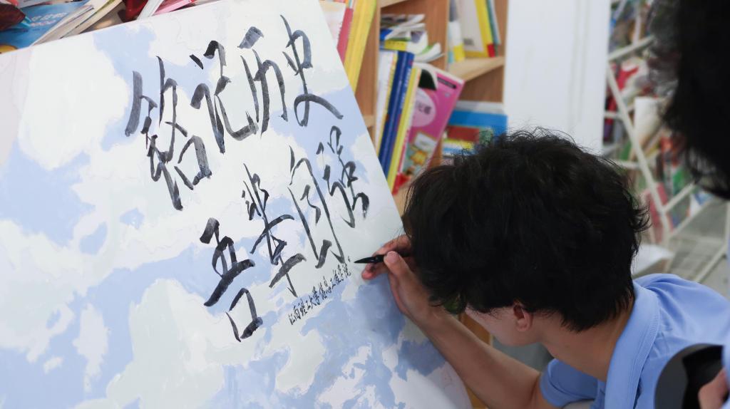 在崇义县上堡乡“童心港湾”,实践队员们与孩子们围坐一堂,共同投入油画的绘制中。孩子们纷纷拿起画笔,在特制的数字油画板上,一笔一画地专心描绘着开国大典的景象。在欢声笑语与默契配合中,一幅生动逼真的开国大典画卷逐渐成形。每一笔、每一画都满含着孩子们对祖国的挚爱和对历史的尊崇之情。实践队员在画上题下的八个字——“铭记历史,吾辈自强”,激励孩子们铭记先辈的奋斗与牺牲,为祖国的繁荣富强贡献自己的力量,也把红色种子播撒在儿童心中,让稚嫩的幼苗茁壮成长、聚木成林。