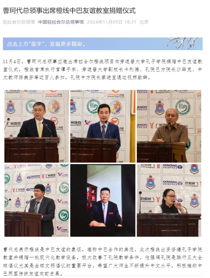 11月4日,曹珂代总领事应邀出席拉合尔橙线项目向旁遮普大学孔子学院捐赠中巴友谊教室仪式,橙线首席执行官谭子东、旁遮普大学副校长卡利德、孔院巴方院长沙菲克、中文教师陈美芬等近百人参加,孔院中方院长蔡进宝通过视频致辞。