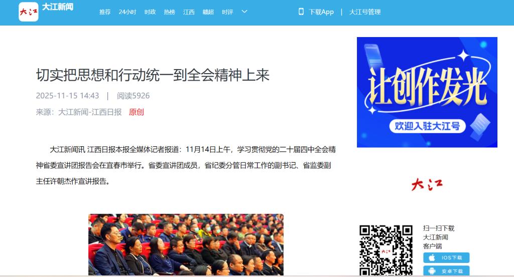 大江新闻讯 江西日报本报全媒体记者报道:11月14日上午,学习贯彻党的二十届四中全会精神省委宣讲团报告会在宜春市举行。省委宣讲团成员,省纪委分管日常工作的副书记、省监委副主任许朝杰作宣讲报告。