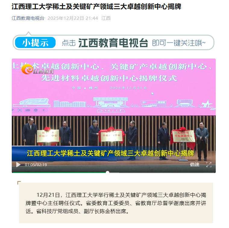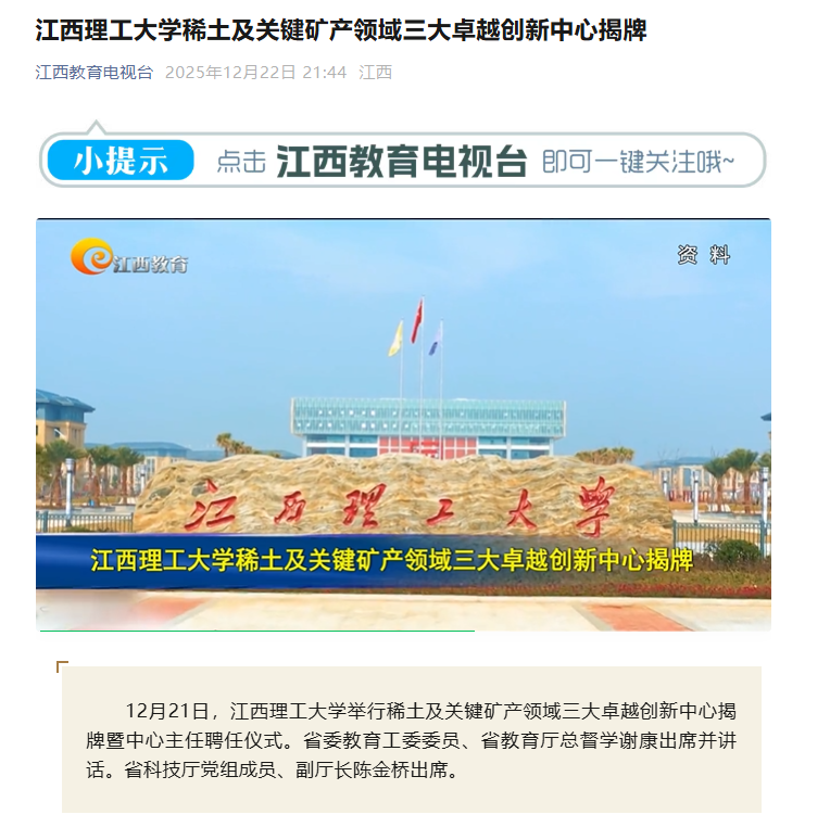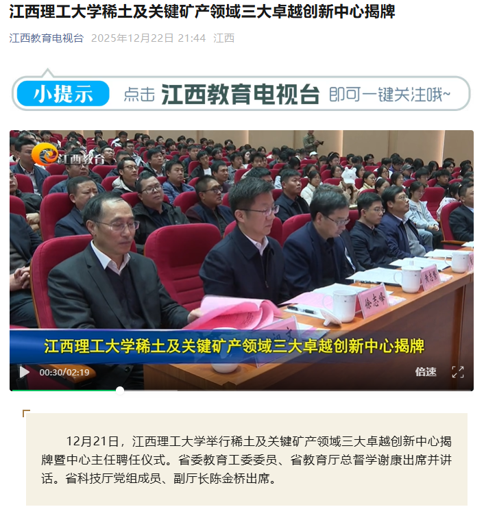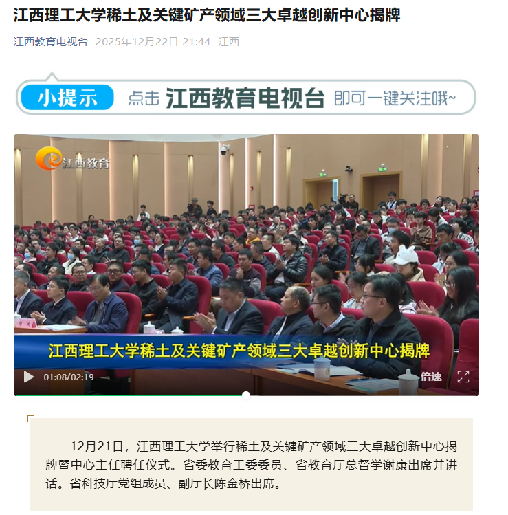 【江西教育电视台微信公众号】:六合彩开奖 稀土及关键矿产领域三大卓越创新中心揭牌