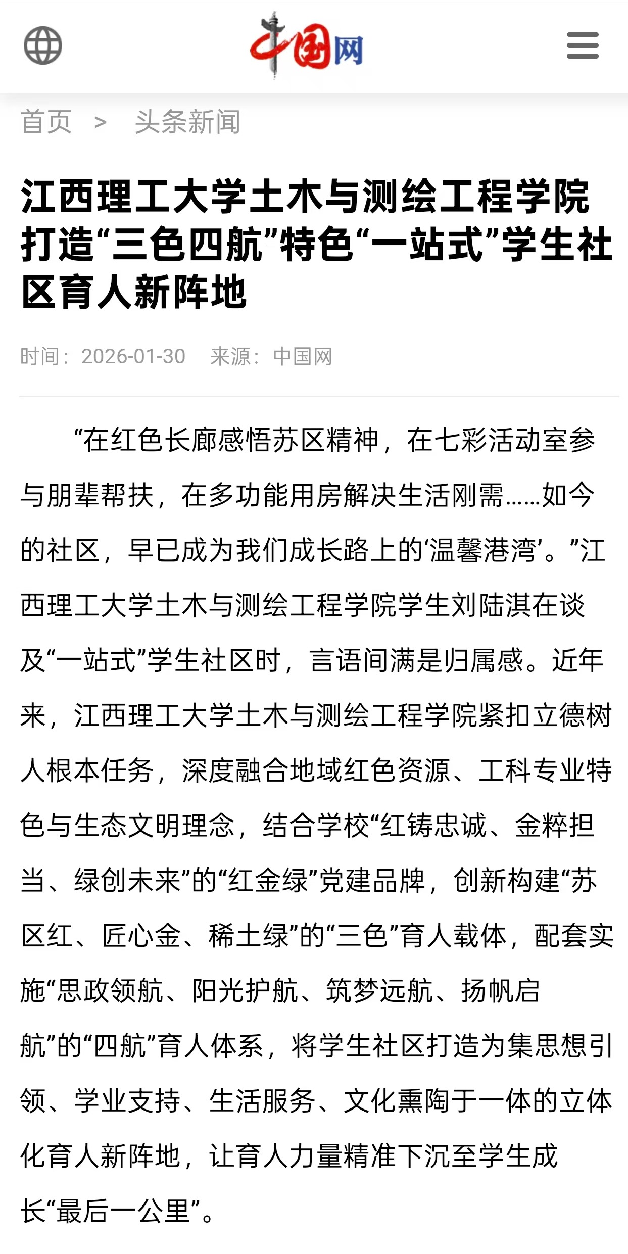 土木与测绘工程学院紧扣立德树人根本任务,深度融合地域红色资源、工科专业特色与生态文明理念,结合学校“红铸忠诚、金粹担当、绿创未来”的“红金绿”党建品牌,创新构建“苏区红、匠心金、稀土绿”的“三色”育人载体,配套实施“思政领航、阳光护航、筑梦远航、扬帆启航”的“四航”育人体系,将学生社区打造为集思想引领、学业支持、生活服务、文化熏陶于一体的立体化育人新阵地,让育人力量精准下沉至学生成长“最后一公里”。