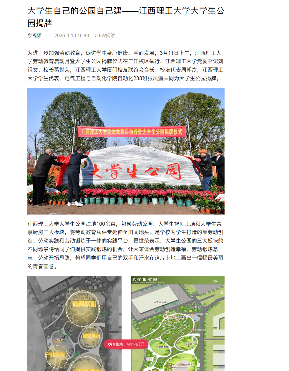 大学生公园占地100余亩,包含劳动公园、大学生智创工场和大学生共享厨房三大板块,将劳动教育从课堂延伸至田间地头,是学校为学生打造的集劳动创造、劳动实践和劳动锻炼于一体的实践平台。葛世荣表示,大学生公园的三大板块的不同场景将给同学们提供实践锻炼的机会,让大家体会劳动创造幸福、劳动锻炼意志、劳动开拓思路,希望同学们用自己的双手和汗水在这片土地上画出一幅幅最美丽的青春画卷。