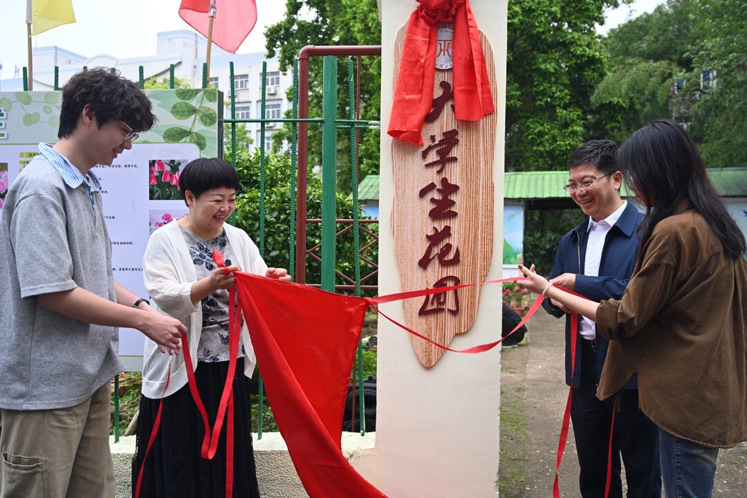 党委常委、纪委书记、监察专员刘飞,党委常委、副校长宁洁及学生代表共同为大学生花圃揭牌。