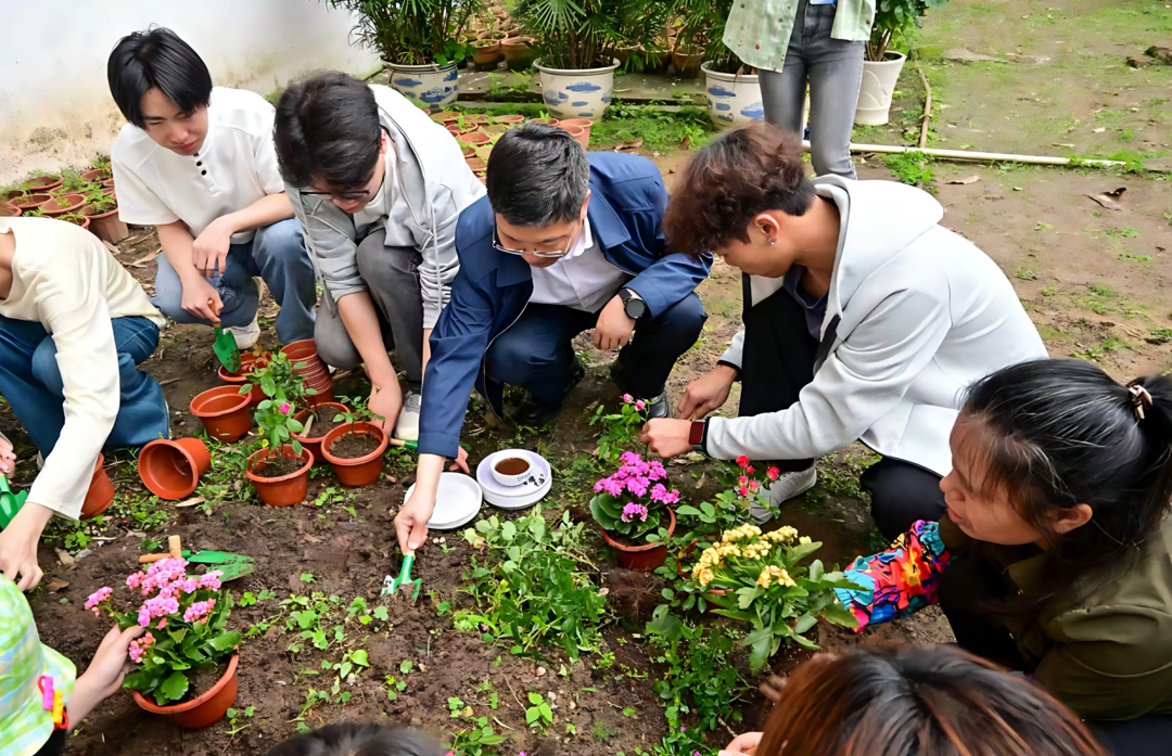 开园仪式后,专业园艺师为现场师生讲解花卉种植与养护技巧。师生们在花圃分工协作、挥锹铲土、扶苗定植、浇水养护,现场一派热火朝天的劳动景象。学生徐元凯感慨道:“亲手种下花苗的瞬间,让我真切地读懂了劳动的意义,更体会到在试错中成长、在汗水中收获的珍贵。”