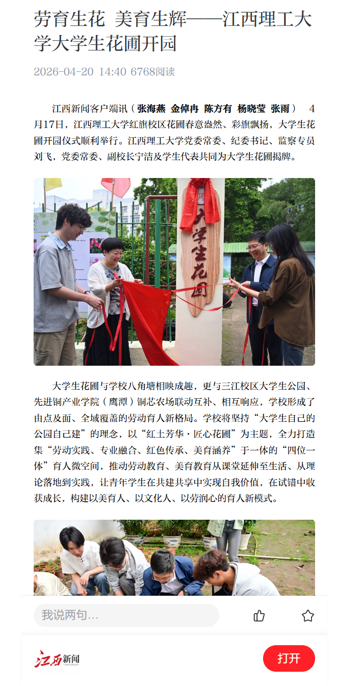 大学生花圃与学校八角塘相映成趣,更与三江校区大学生公园、先进铜产业学院(鹰潭)铜芯农场联动互补、相互响应,学校形成了由点及面、全域覆盖的劳动育人新格局。学校将坚持“大学生自己的公园自己建”的理念,以“红土芳华·匠心花圃”为主题,全力打造集“劳动实践、专业融合、红色传承、美育涵养”于一体的“四位一体”育人微空间,推动劳动教育、美育教育从课堂延伸至生活、从理论落地到实践,让青年学生在共建共享中实现自我价值,在试错中收获成长,构建以美育人、以文化人、以劳润心的育人新模式。