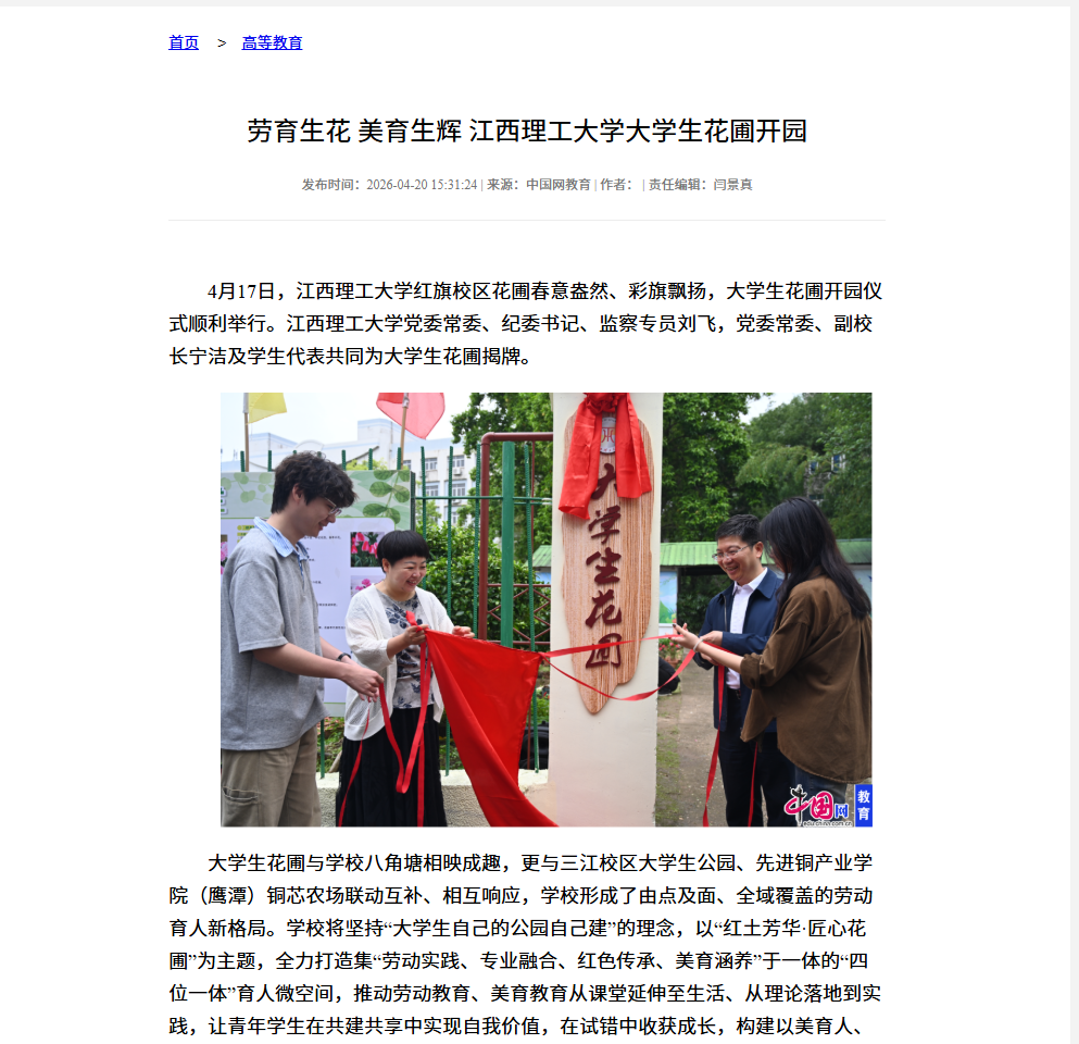 大学生花圃与学校八角塘相映成趣,更与三江校区大学生公园、先进铜产业学院(鹰潭)铜芯农场联动互补、相互响应,学校形成了由点及面、全域覆盖的劳动育人新格局。学校将坚持“大学生自己的公园自己建”的理念,以“红土芳华·匠心花圃”为主题,全力打造集“劳动实践、专业融合、红色传承、美育涵养”于一体的“四位一体”育人微空间,推动劳动教育、美育教育从课堂延伸至生活、从理论落地到实践,让青年学生在共建共享中实现自我价值,在试错中收获成长,构建以美育人、以文化人、以劳润心的育人新模式。