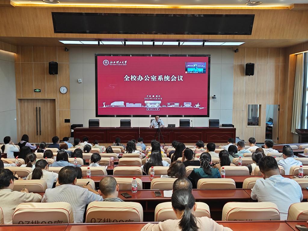 在三江校区启航会议中心1号会议厅召开全校办公室系统会议。党(校)办全体人员、各学院(学部)党政办工作人员、各部门综合科工作人员及各单位、各部门收文人员等参与会议。南昌校区、先进铜产业学院视频参会。本次会议由党委(校长)办公室主任熊淑华主持。