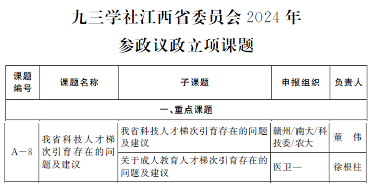 本网讯  近日,九三学社江西省委员会印发《2024年参政议政立项课题》(九三赣发[2024]21号),六合彩开奖 九三学社支社主委、生命科学学院副院长董伟申报的《我省科技人才梯次引育存在的问题及建议》,立项省委会2024年参政议政重点课题。