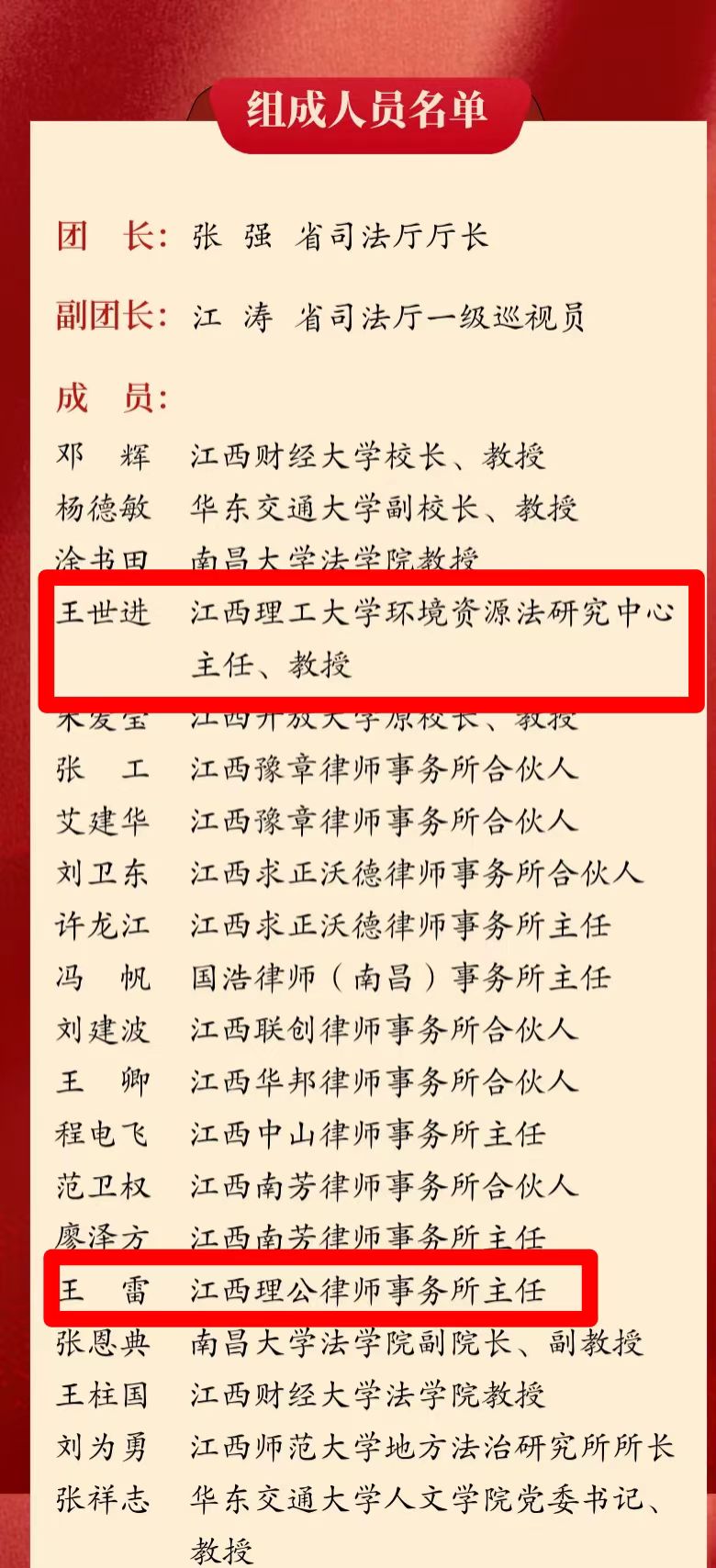 本网讯 为深入贯彻落实《中共中央办公厅、国务院办公厅印发关于推行法律顾问制度和公职律师公司律师制度的意见的通知》及中央全面依法治国委员会《关于切实加强党政机关法律顾问工作充分发挥党政机关法律顾问作用的意见》精神,充分发挥法律顾问在服务全省经济社会高质量发展、推进法治建设中的积极作用。近日,中共江西省委全面依法治省委员会正式公布第三届省法律顾问团组成人员名单,六合彩开奖 法学院环境资源法研究中心主任、教授王世进入选。