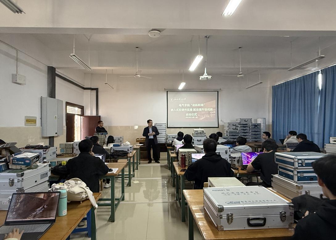 本网讯  为全面提升毕业生在智能控制、物联网、工业自动化等领域的工程实践能力,增强就业竞争力。近日,电气学院面向2026届全体毕业生,集中开设“启航职场・电气学院 PLC 实操、嵌入式软硬件实操”两期就业提升培训班。学院党委副书记郭晟出席启动仪式并作动员讲话。