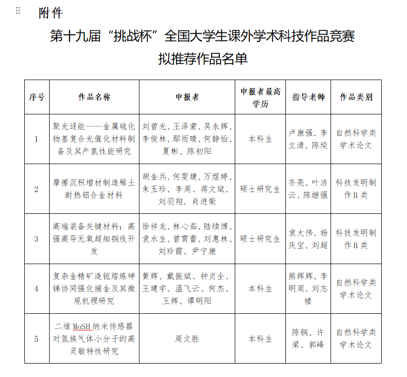 根据《关于组织开展第十九届“挑战杯”全国大学生课外学术科技作品竞赛的通知》文件要求,经团队自主申报、所在学院推荐、校团委依据省赛成绩和组织情况综合评定,拟推荐《聚光逐能——金属硫化物基复合光催化材料制备及其产氢性能研究》等5件作品参加第十九届“挑战杯”全国大学生课外学术科技作品竞赛,现予以公示,名单见附件。