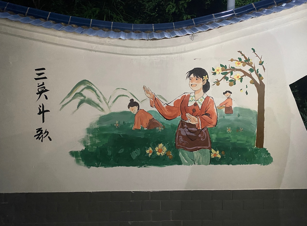 实践队员们将“三英斗歌”的故事以绘画和书法的方式展现,乡村人民的蓬勃朝气和建设热情于墙面跃然而出。队员王骁骜感叹道:“身为江理学子,我们一定会在这次实践中培养服务意识,为乡村振兴提供服务,用年轻的笔触生动形象地勾勒出乡村振兴的美好未来画卷。”