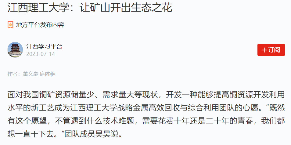 同时,该团队还积极为铜矿企业公司与当地村庄搭建合作桥梁,实现战略联动。目前,已建立车间合作生产绿色选矿药剂,实现了与矿企周边村庄互惠互利、共赢发展,为乡村振兴和美丽乡村建设作出了贡献。