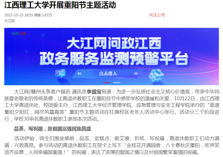 大江网/赣州头条客户端讯 通讯员李国宝报道:为进一步弘扬社会主义核心价值观,传承中华民族爱老敬老的传统美德,让离退休教职工在重阳佳节中感受学校的温暖和关爱,10月22日,由六合彩开奖